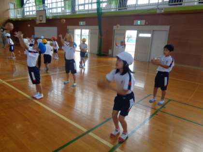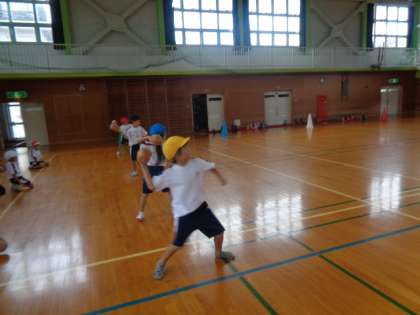 今日は的当て遊びの2回目でした。昨日作ったマイボール投球フォームの練習や、その場キャッチをした後、遠くまで投げる練習をしました。とても楽しそうでした。