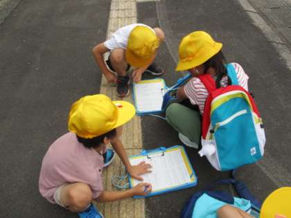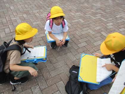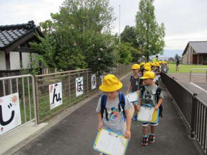 保育園に着きました。早速友達のクイズを解きにあちこちを見て回っています。