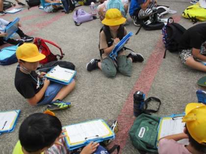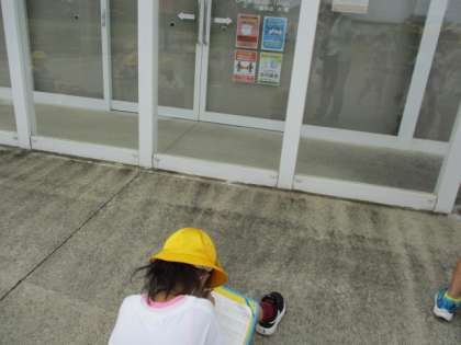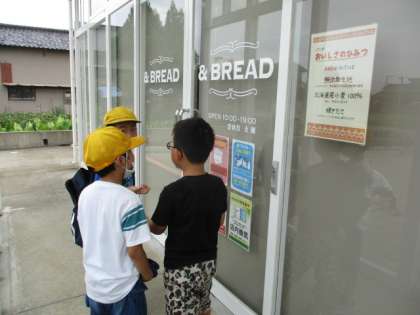 パン屋さんにつきました。開店前ですが、パンが焼けるいいにおいがします。クイズの答えを見つけに子供たちはあちらこちらを見て回っています。