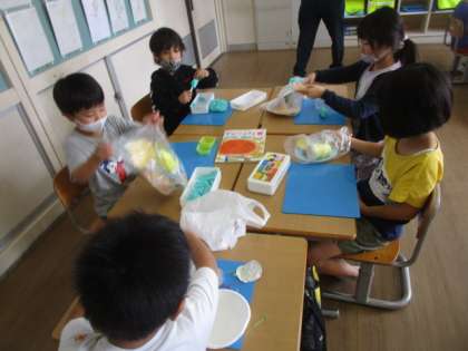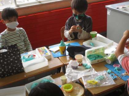 先週に引き続きねんどでごちそうを作りました。子供たちは先週よりさらにパワーアップしたごちそうを作るために準備してきました。中には、友達と意見を出し合いながら、おいしそうなごちそうをたくさん作っているグループもありました。