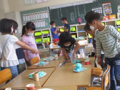 作品鑑賞の時間です。お友達にどんなごちそうを作ったのか質問しながらコメントしています。