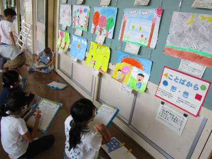図画工作科の学習では、「ことばから形・色」の友達の作品を鑑賞しました。友達がどのように想像したかを確認しようと、詩を読んでから絵をみるなどして、友達の作品のおもしろさを感じていました。