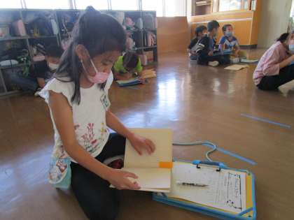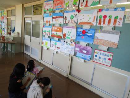 図画工作科の学習では、「ことばから形・色」の友達の作品を鑑賞しました。友達がどのように想像したかを確認しようと、詩を読んでから絵をみるなどして、友達の作品のおもしろさを感じていました。