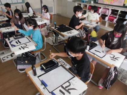 火曜日に、習字をしました。「元」という字でまがる所やはねに気を付けて、お手本を見ながら書いていました。形を整えて書く姿は素敵でした。