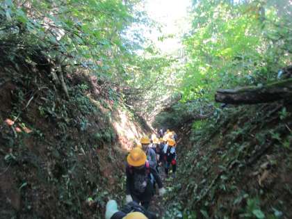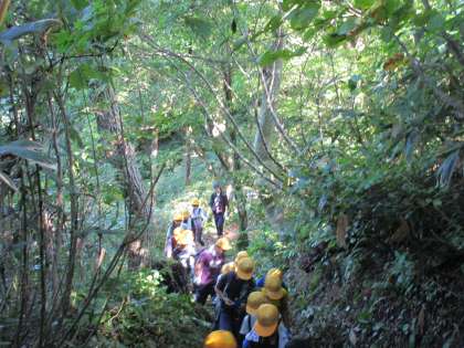 アスファルト道を通った後は、山道を通りました。昨日までの雨の影響もあって滑りやすかったですが、気を付けて登りました。「滑るよ」等、声をかけ合う姿もあり、相手意識が感じられました。
