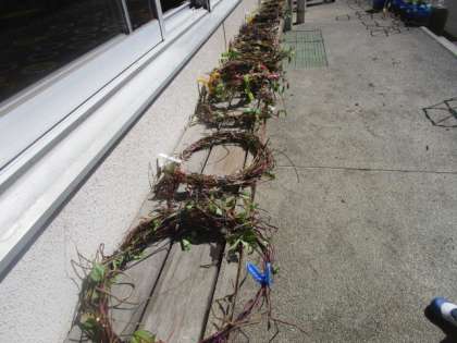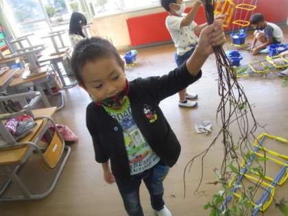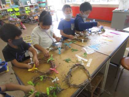 生活科の時間にあさがおリースを作りました。つるが絡まり合ってつるをまとめるだけでも一苦労しました。活動を通して、こちらから声をかけなくても友達同士で協力したり片付けを率先して行ったりする姿が見られ、子供たちの成長を実感しました。