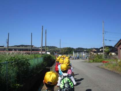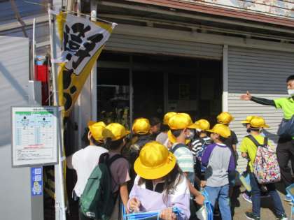 千里ショップでは、子供たちはお店の旗やベンチ、看板に注目していました。