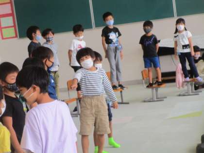 劇の練習では、本番を意識して少しずつ小道具が増えてきました。今日は妖精のステッキや床屋のかばんやくわを用いて練習しました。子供たちの動きもだんだんと大きくなってきています。この調子でがんばっていきましょう!