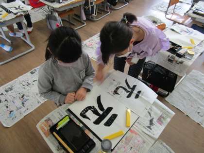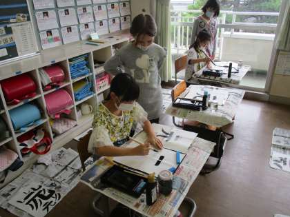 【3年生】毛筆の学習 公開日 2020/10/07 更新日 2020/10/07 3年生 毛筆の学習では、「曲がり」の筆遣いに気を付けて、「元」を書きました。友達からアドバイスをもらいながら、集中して丁寧に書くことができました。友達からのアドバイスのおかげで「上手に書けた」と話す子供もいました。