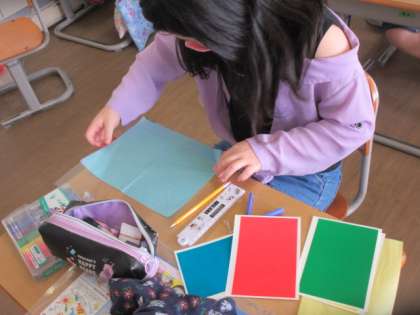 【4年生】光のさしこむ絵 公開日 2020/10/07 更新日 2020/10/07 4年生 図工の様子です。光のさしこむ絵です。 できあがった作品に窓に飾ってみると、今日のすてきな雲とのすてきなコラボレーションになりました。みんな集中して取り組みました。