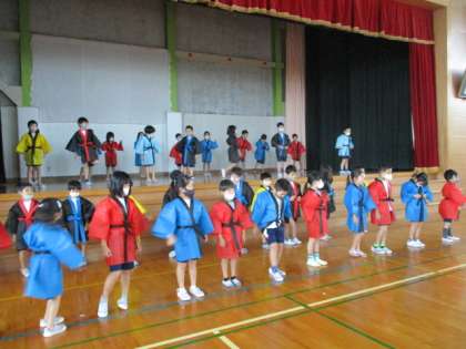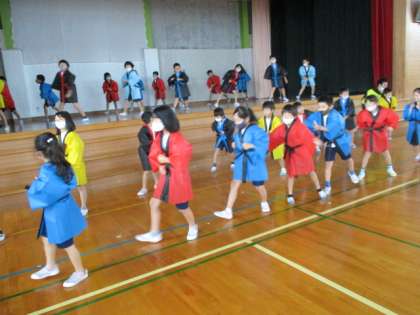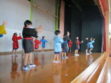 今日は実際に衣装を着て練習しました。新しい衣装を着ると、普段の動きとはまた感じ方が変わり、「動きにくいなあ」という声も聞こえてきました。衣装を着て練習する時間も今後増えていきます。かっこいい衣装を着た子供たちの、元気よく演じ、踊る姿を当日見られることが楽しみです。