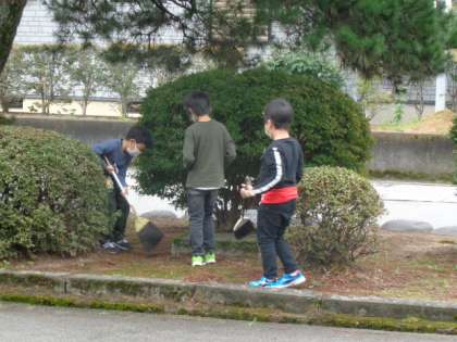 【1年生】朝の手伝い 公開日 2020/10/09 更新日 2020/10/09 1年生 朝の会までの時間を使って、前庭の松の落ち葉そうじをしています。誰に言われたわけでもないのに、自分たちで学校のためになることを見付け、働くことができるすてきな子供たちです。