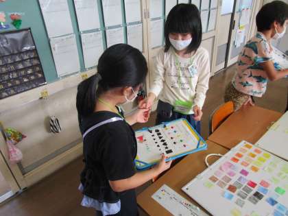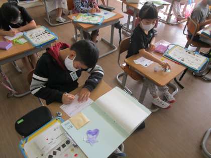 外国語活動「This is for you.」の学習では、友達に「Thank youカード」を贈るため、友達の好きな色や形を聞き出し、カードに飾りを付けたり、メッセージを書いたりしました。形を集める活動では、前時よりも自信をもってやり取りする姿が見られました。