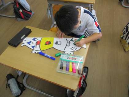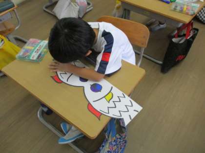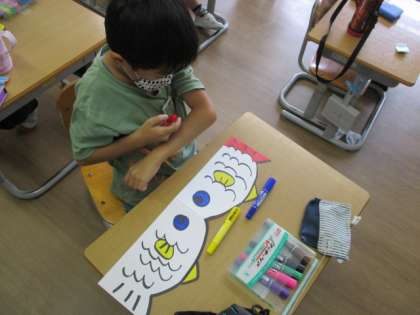 劇の魚役の子供たちで、頭の飾りを作りました。それぞれカラフルに魚を塗り、個性あふれる魚になりました。