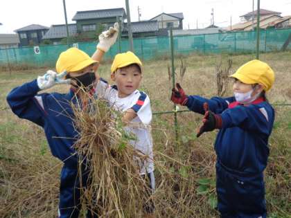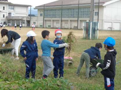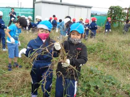 来週火曜日の芋掘りに向けて、2年生と畑の草むしりをしました。なかよし班の2年生さんとペアになって活動しました。
