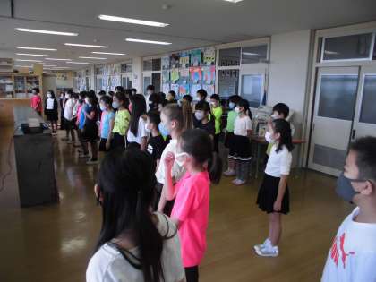 学習発表会本番前の様子です。大きな声で台詞を言ったり顔をほぐしたりと本番に向けて気持ちを高めています。気をつける所も確認をして、41人でハーモニーを創り上げます。