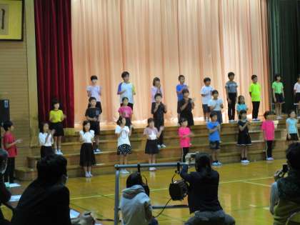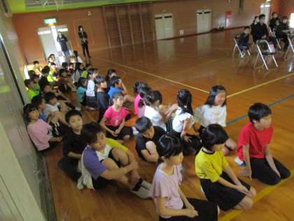 いよいよ本番。体育館に入ると少し表情がこわばる子供たちでしたが、「3年生のみなさん、よろしくお願いします。」とアナウンスが入ると、元気のいい「はい」が響き、ドキドキワクワクした表情でステージへ向かっていました。