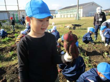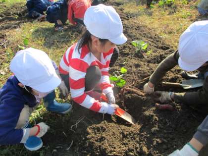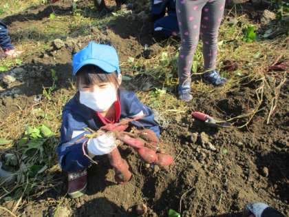 「こんなに大きないもが掘れたよー!」と見せに来てくれる子や、友達と一緒に一生懸命さつまいもを掘っている子もいました。友達と大きさを比べている様子も見られました。
