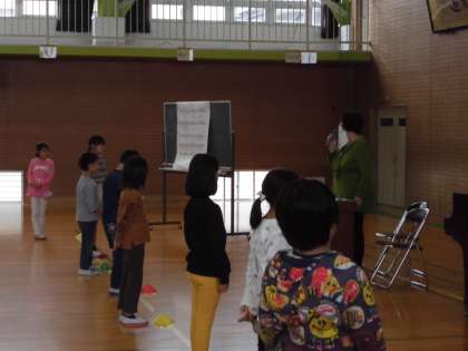 声楽を専門に活躍されている串田先生を招いて、合唱指導を行いました。口を大きく開けたり、手拍子でリズムをとったりする事を教えてもらいました。最後には、楽しそうに歌っていました。串田先生も、楽しく歌うことを大事にしてほしいと言葉がありました。