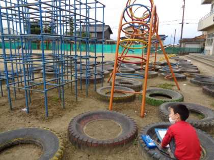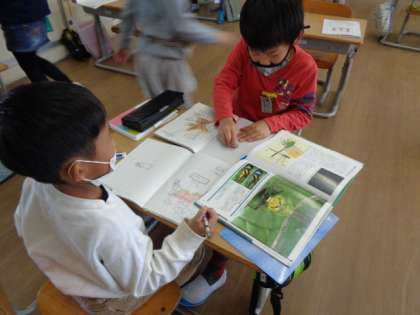 神保小学校で見付けたすてきなものを家の人に知らせる学習をしています。今日は、それぞれの知らせたいものを絵と言葉でかく勉強をしました。しっかり伝えられるように細かいところまで調べていました。