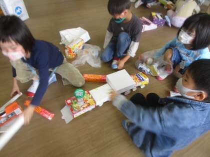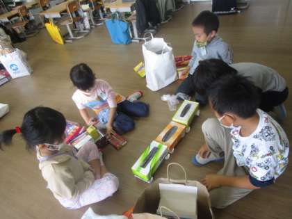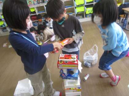 算数の時間に新しい単元のかたちあそびで空き箱や空き缶を使っていろいろな物を作りました。でんしゃやタワー、キリンを友達と協力しながら一生懸命作る中で、タワーでは土台はしっかりとした物がいいということや、電車の車輪は同じ大きさにした方がよいなど体験を通して学んでいました。