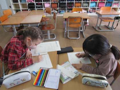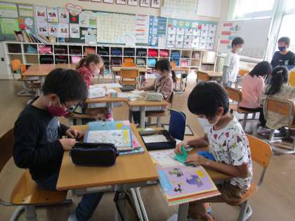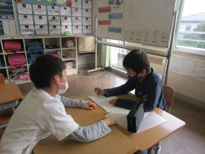 クラスのみんなが楽しくなるように、係で意欲的に活動しています。みんなでできる遊びを考えたり、図書館で生き物や植物を紹介する新聞を作ったりするなどしていました。「みんなが楽しくなるように」と考え、進んで友達にインタビューをしてみんなの考えを活動に生かそうとしている係もありました。楽しい活動が増えてきそうで、楽しみです。