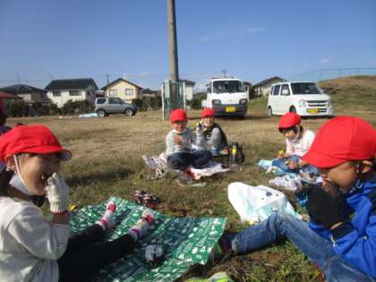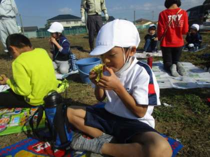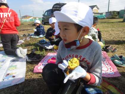 おいしいサツマイモを前に、口いっぱいにほおばって食べていました。