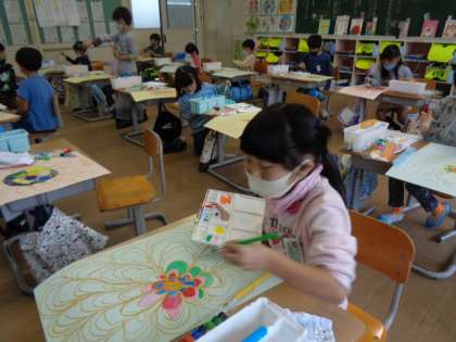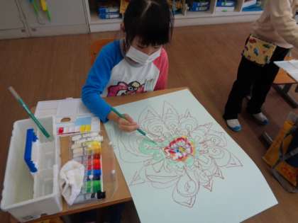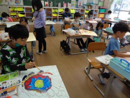 今日は水彩絵の具で彩色をしました。子供たちは絵の具が大好きです。楽しんで塗っていました。