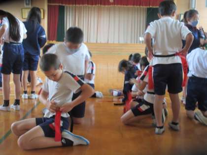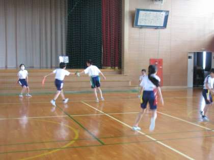 【4年生】タグラグビー 公開日 2020/11/04 更新日 2020/11/04 4年生 今日から、タグラグビーの学習が始まりました。1組と2組混合のチームで行います。合言葉は「ぽかぽかタグラグビー」です。互いに思いやりの声をかけあいながら取り組みます。