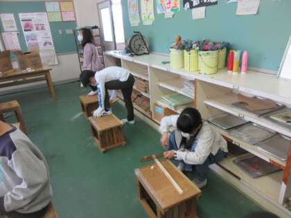 【4年生】のこぎりぎこぎこ・・・ 公開日 2020/11/04 更新日 2020/11/04 4年生 先週に引き続き、のこぎりを用いた学習をしました。 困っている友達には自分から声をかけて助ける姿も見られました。 個性が光る、すてきな作品になりました。