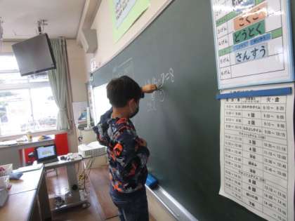 【1年生】くりさがりのある引き算 公開日 2020/11/04 更新日 2020/11/04 1年生 くりさがりのある引き算では、10といくつでサクランボにして計算しています。今日は、文章を読んで式を立てて答えました。子供たちは文章から、足し算かな、引き算かなと迷う場面もありましたが、お友達の意見や考えを聞いて納得していました。