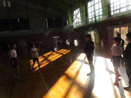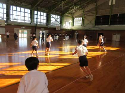 体育の様子です。今日はラグビーボールを使ってパスの練習をしました。