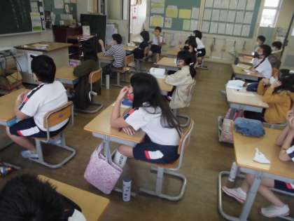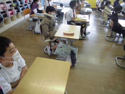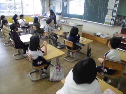 1組でも、朝の時間に学校の職員の方から読み聞かせをして頂きました。昔話の読み聞かせで、初めてのお話で子供たちは興味深そうに話をきいていました。