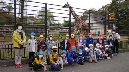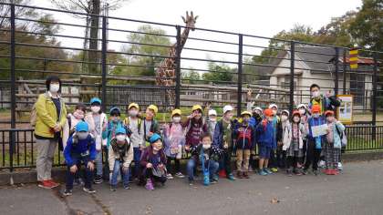 今日は待ちに待った校外学習でした。子供たちは、友達とファミリーパークに行くことを楽しみにしていました。早速大きなキリンに出会い、嬉しそうな子供たちです。