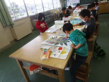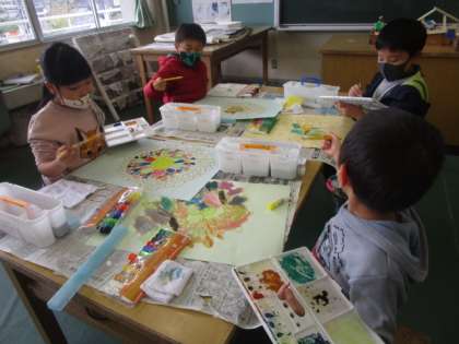 先週に引き続き『世界に一つだけの花』の色塗りを水彩でしました。子供たちは、一枚一枚花びらを丁寧に異なる色で塗っていました。水の量や混ぜる色の分量を変えて、色に変化を与えながら活動していました。