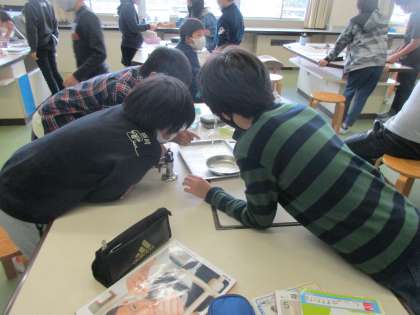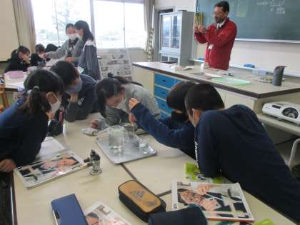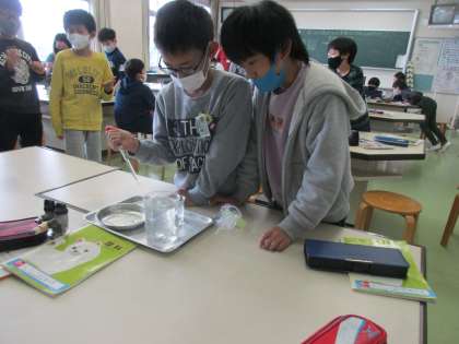グループに分かれて実験しています。慎重に準備し、真剣に観察しています。