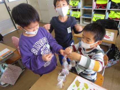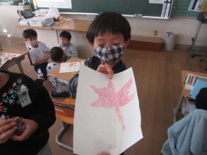 【1年生】秋を楽しもう! 公開日 2020/11/10 更新日 2020/11/10 1年生 秋の木の実や葉っぱを使って秋を楽しみました。落ち葉でこすりだしを行ったり、ドングリ袋を作ったりしました。子供たちは、秋ならではの自然を楽しみました。