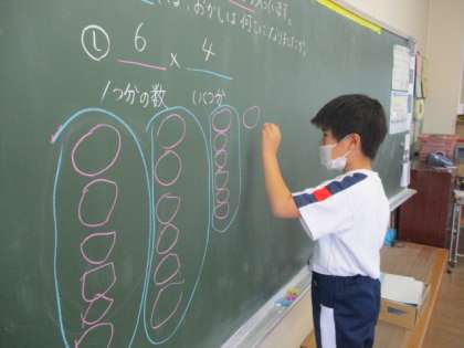 文章問題から、かけ算の式を組み立てました。「○個のかたまりを□セット分」という言葉を思い出して、いくつかの問題も図や言葉で表して立式することができました。