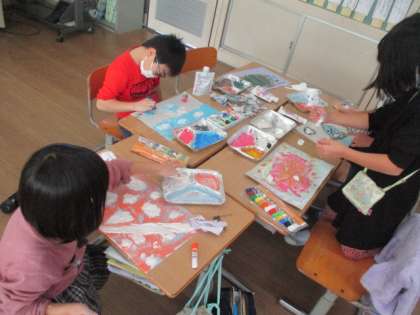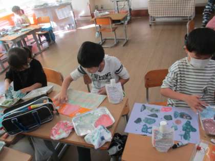 【2年生】とろとろの絵の具で! 公開日 2020/11/19 更新日 2020/11/19 2年生 液体粘土を使った表現活動をしました。はじめは真っ白のねんどで、子供たちは口を揃えて「生クリームみたい」と言っていました。 しかし、子供たちが様々な色の絵の具を加えると、そこから繋げて想像するものも、海や桃、ブドウ等、人それぞれ変わっていきました。 いつもの筆で描く水彩、クレヨンでの活動とは、ひと味もふた味も違う、指先や手の平全体での表現活動に、どの子供も楽しみながら取り組んでいました。