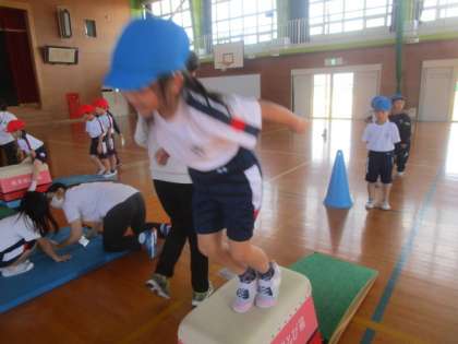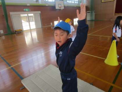 3段の跳び箱からジャンプして体操選手のように決めポーズをぴしっと決めていました。