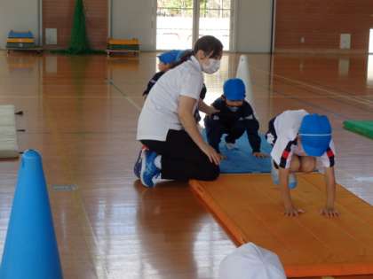 今日は富山市体育協会の先生をお呼びして、跳び箱を教えていただきました。跳び箱に必要な技術を一つ一つ丁寧に教えていただきました。