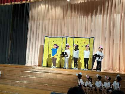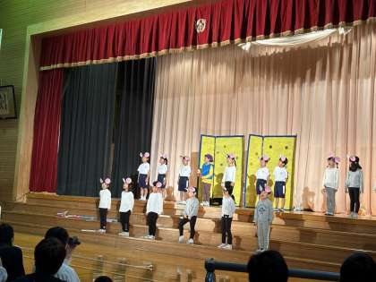 1年生の発表です。 劇「おむすび ころりん」です。 お客さんまで届く声の大きさ、間合いに気を付けてきました。