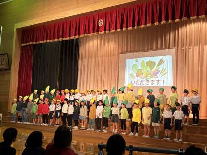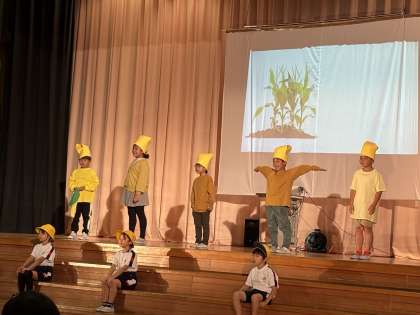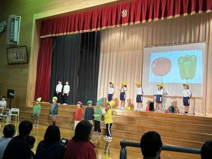 2年生は、生活科で育てた野菜になって演技しました。野菜づくりで学んだことを歌や台詞で表現しました。