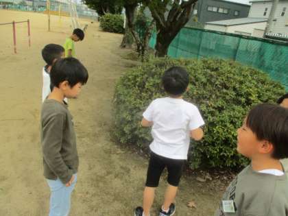 【2年生】生活科 公開日 2024/10/22 更新日 2024/10/22 2年生 生活科の学習では、「生きものと友だち」の学習をします。今日は、グラウンド周辺にいる生き物を探しに行きました。落ち葉の下や木の幹、草むらをよく観察しました。学校には、トンボやバッタ、ダンゴムシ等いろいろな生き物がいることが分かりました。