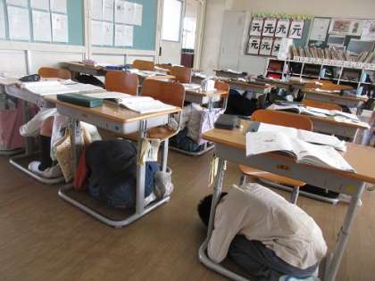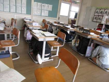 3年生 避難訓練 公開日 2024/10/22 更新日 2024/10/22 3年生 今日の避難訓練は、Jアラートの緊急情報が発信されたときの自分の命や安全を守るための訓練でした。自分の机をワーク側に寄せ、頭をワーク側に向けて机の下で避難姿勢をとりました。