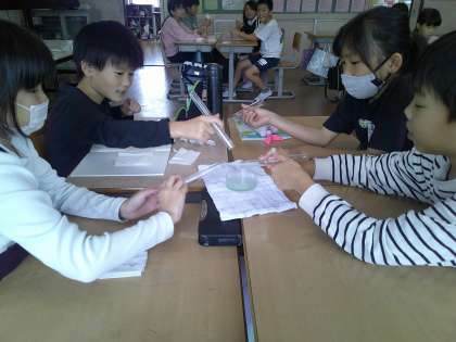 理科の学習で、試験管の口にせっけん水をつけて、せっけん水の膜がどのように変化するか実験をしました。あたためていると、どんどん変化していく膜の様子を見て、とても楽しそうでした。