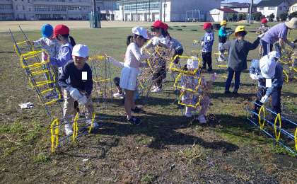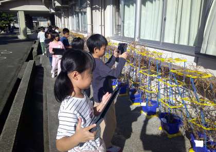 5月から育て、先日種取りをしたアサガオの片付けを行いました。初めに、感謝の気持ちを込めて、今のアサガオの様子を写真に撮り、その後、畑の近くで、支柱からアサガオを外しました。2年生になったら、この支柱を使って野菜づくりに挑戦する予定です。