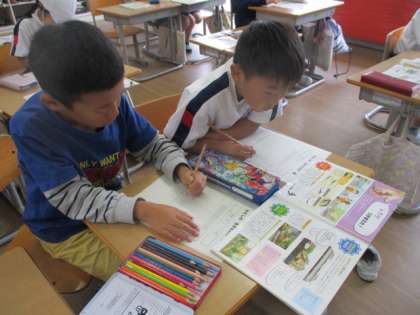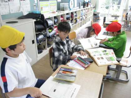 「生きものと友だち」の学習では、教科書や本を見ながら、自分が飼ってみたい身近な生き物の飼い方を調べました。