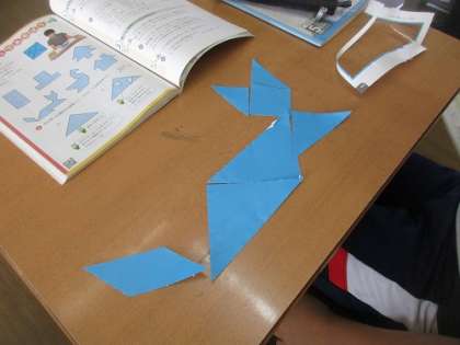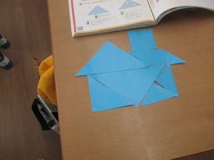 タングラムタングラム 公開日 2024/10/31 更新日 2024/10/31 3年生 算数科で、図形を組み合わせて、いろいろな形を作りました。「キツネ」「鳥」「家」「ツリー」などを作りましたが、正方形や平行四辺形の組み合わせ方が難しく苦労しました。