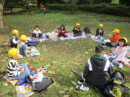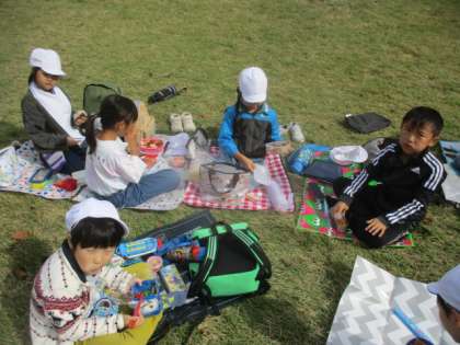 芝生広場でグループごとにお弁当を食べました。みんなでお話しながら仲良く食べていました。